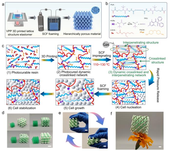 超临界流体发泡结合光固化3D打印制备分级多孔聚氨酯弹性体泡沫示意图