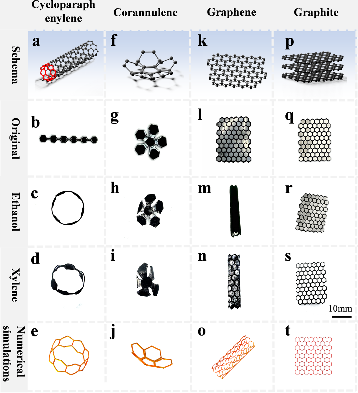该研究以CNTs-PDMS为基底,表面通过磁控溅射Al图案层(各向异性表面约束),底部采用紫外改性技术生成氧化硅(SiOx)梯度层(极性溶剂响应层),制备复合膜系。利用线弹性理论与有限元计算预测长宽比与最终形貌之间的关系,实现非对称结构设计。该致动器表现出对乙醇、有机溶剂和近红外光的快速多重响应、可逆循环的变形能力(500以上循环)以及水滴冲击发电(开路电压可达约96.8 V,持续点亮101个商用绿色LED灯)。基于以上特性,团队展示了仿生抓手、光控开关、仿生飞蛾以及环境酒精浓度的实时无源监测系统等多应用场景。为多功能软体机器人、环境自适应智能器件以及自供电传感系统的开发提供了新的设计思路。