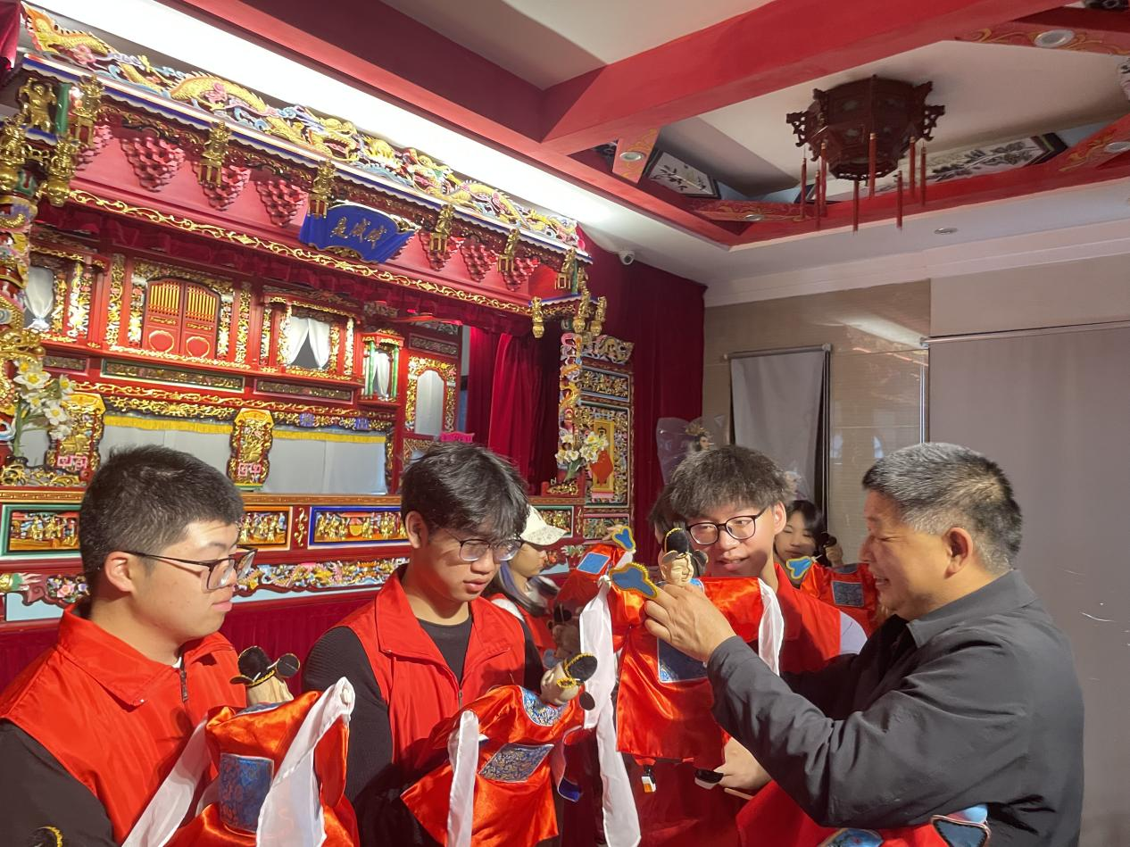 走进漳州木偶艺术展示馆,实践队被眼前的一幕深深吸引:数十尊木偶静立于暖光之中,生旦净末丑,行当分明,或雍容华贵,或诙谐灵动。馆长徐强向实践队成员介绍了漳州木偶戏的历史源流与艺术特色,实践队成员在传承人的指导下,还尝试体验操纵木偶,“亲眼看到木偶在艺人手中仿佛被赋予生命,每一个动作、每一个眼神都蕴含着深厚的情感与技艺,我才真正理解什么是‘以偶代言、以手传神’。”实践队员陈鑫霞在体验木偶操纵后说。